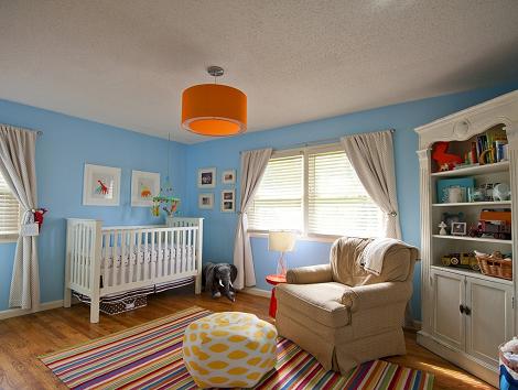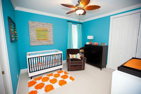 Como verás los colores ideales en la decoración, para combinar con azul, son el naranja y el amarillo. Aunque en la habitación azul para una bebé niña suele aprovecharse para «feminizar» con toques en rosita.