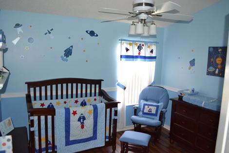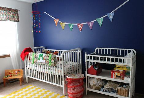 Habitación bebé azul: el azul oscuro se suaviza con una pared en blanco