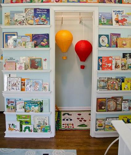 Por último, una idea muy bonita, tanto para una habitación de viajes como de cualquier otra temática: ¡crear un tabique de libros! En baldas, los libros sirven para decorar las paredes que rodean una especie de vestidor, dentro de la habitación. ¡Me chifla!