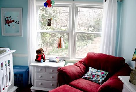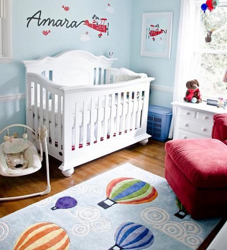 Más globos veremos como estampado de la alfombra (monísima) y cómo móviles en el techo. El azul, color del cielo está presente en paredes y decoración, aunque hay muchos toques de color, especialmente en rojo. ¡Me gusta mucho la decoración de pared, con el nombre de la niña y un avioncito pilotado, quizá, por ella misma.