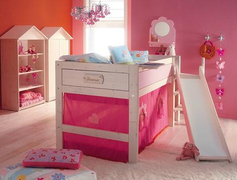 Y es que para decorar las habitaciones de las más pequeñas hay muebles infantiles muy originales y coquetos adaptados a los gustos de las niñas, como las habitaciones de estilo princesa, con guiños a Hello Kitty, con doseles, etc. Como puedes ver en esta primera imagen una cama alta con tobogán puede ser más que una cama y convertirse en un espacio para jugar y soñar!
