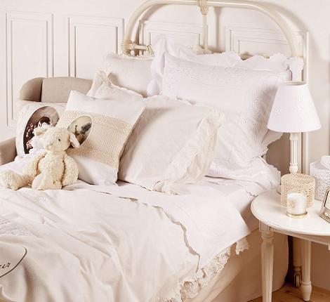Vintage treasures se compone de sábanas, fundas nórdicas, edredones, mantas, cojines, peluches, butaca, cortinas, cestas y ropita, todo de estilo vintage y en colores que van del blanco al beige.